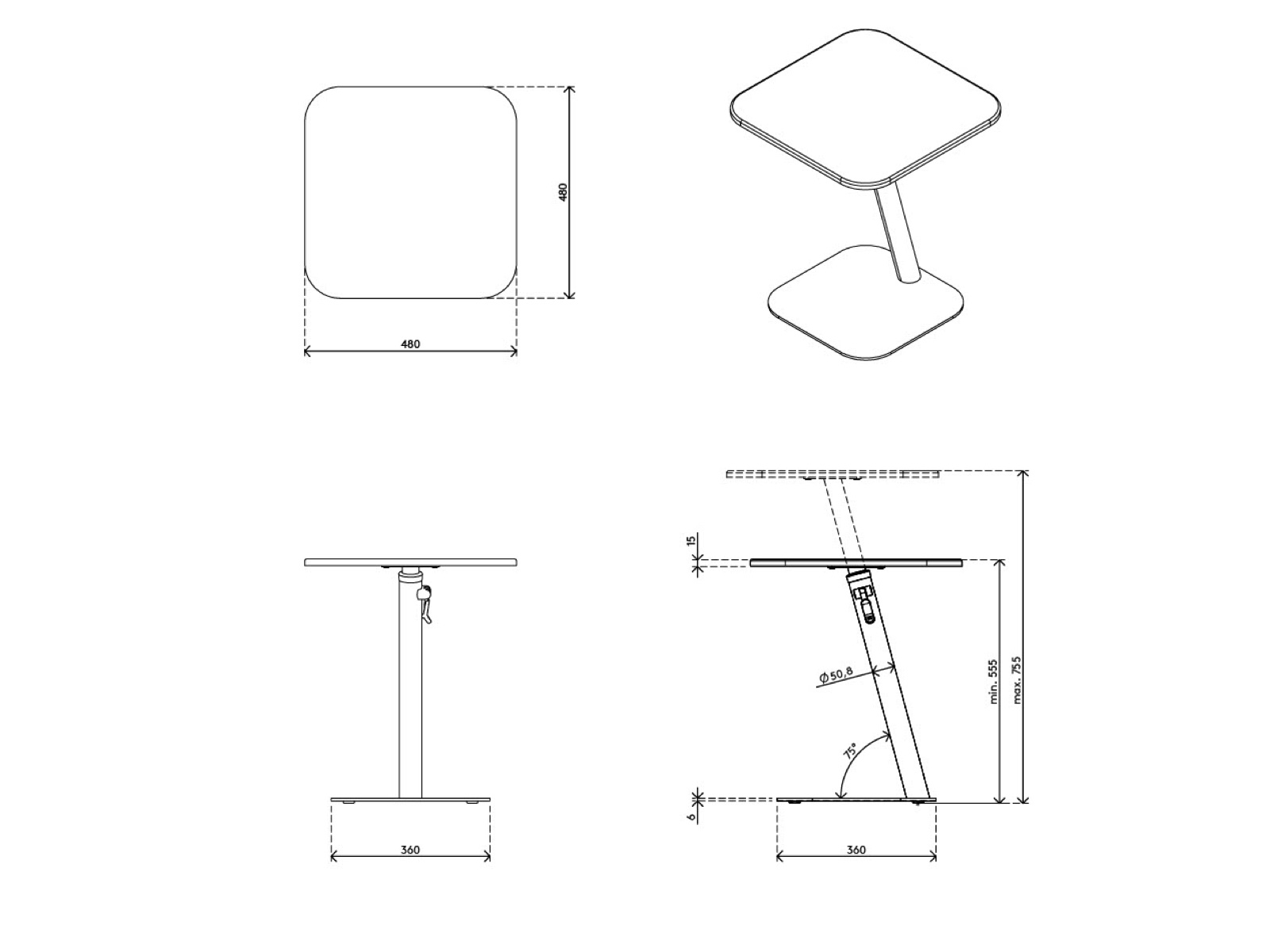 - Afmetingen (b x d x h): 480 x 480 x 555 – 755 mm
