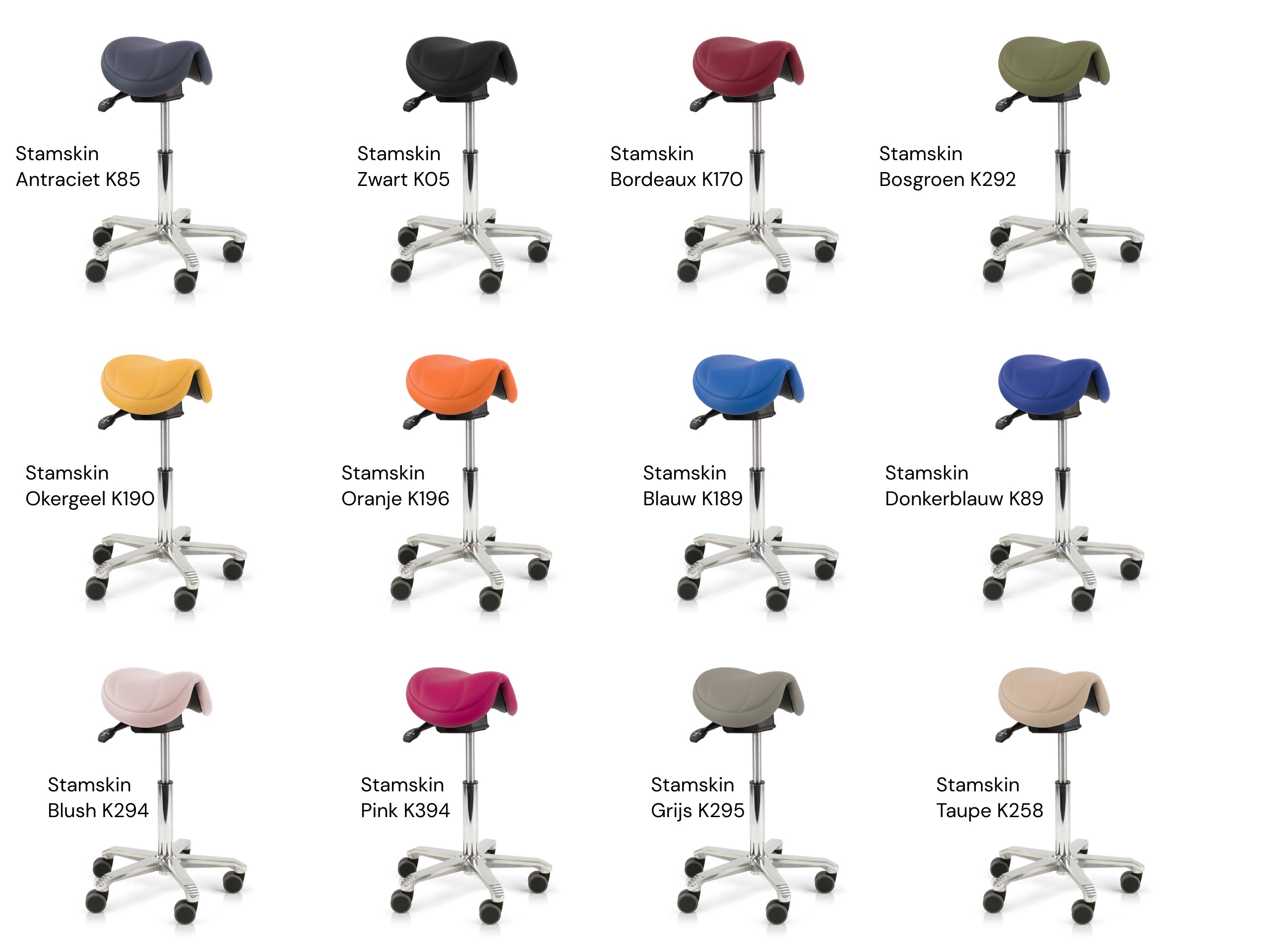 | Stamskin stofkleur | Antraciet K85, Black K05, Blauw K189, Blush K294, Bordeaux K170, Bosgroen K292, Donkerblauw K89, Grijs K295, Okergeel K190, Oranje K196, Pink K394, Taupe K258 |